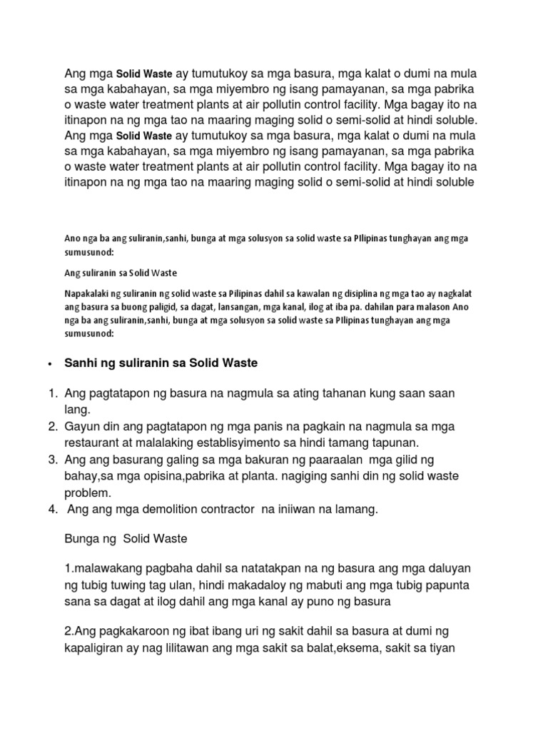 Kung nagkaroon na ako ng COVID-19 at gumaling na kailangan ko pa bang mabakunahan. Nagkaroon pa nga ng kaliwat kanang kampanya ang gobyerno at pribadong sektor upang tutukan natin ng atensyon na ang hindi tamang pagtapon ng basura ay nagdudulot ng pinsala sa lugar. Upang maiwasan ang anumang problema na sanhi ng basura ay dapat tayong gumawa ng solusyon o paraan upang malutas ang ating suliranin sa.