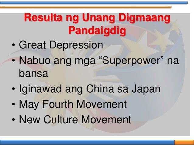 Mga sanhi at bunga ng unang digmaang pandaigdig. Dalawang malaking salik na bunga ng unang digmaang pandaigdig unang digmaang pandaigdig nagtapos ang lahat ng ito nang sumiklab ang _________________ na nagdulot ng matitinding negatibong epekto sa ekonomiya ng maraming bansa at malaking salik na nagbunga ng great depression at gold standard crisis. Maraming nasirang ari-arian halos 60 bansa and naapektuhan at mas maraming bilang ang namatay kumpara sa Unang Digmaang Pandaigdig. Paglalahad ng mga naging bunga ng Ikalawang Digmaang Pandaigdig Objective 1.