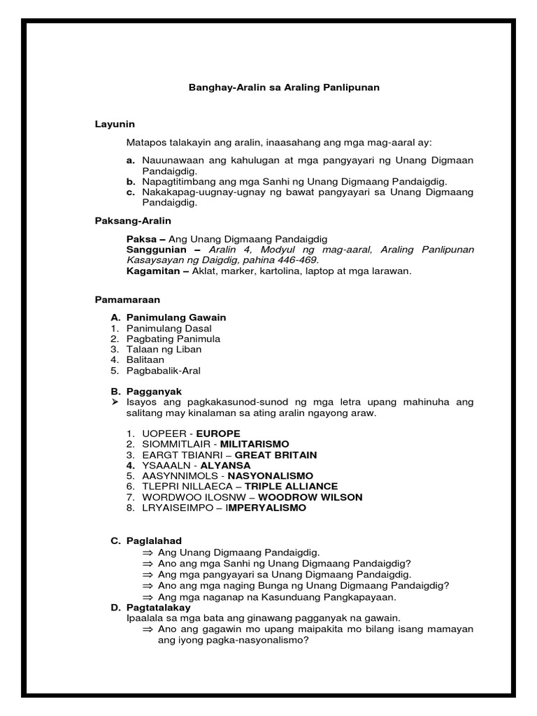 Isang pangmundong sagupaan at labanan na nagpasimula sa Europa ang Unang Digmaang Pandaigdig WWI. Noong 146 BCE ang Macedonia ay nagging isang lalawigan ng Rome. NASYONALISMO Ang matinding pagmamahal ng mga mamamayan sa kanilang sariling bayan o bansa ay tinukoy bilang nasyonalismo.